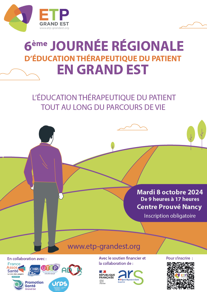 L’Espace Ressources en ETP Grand Est a le plaisir de vous inviter à la 6ème journée régionale d’ETP Grand Est. Cette année sera l’occasion de nous retrouver en présentiel au Centre Prouvé à Nancy, le 8 octobre 2024 de 9h à 17 heures. La thématique de cette année sera « l’Education Thérapeutique du Patient : tout au long du parcours de vie. »