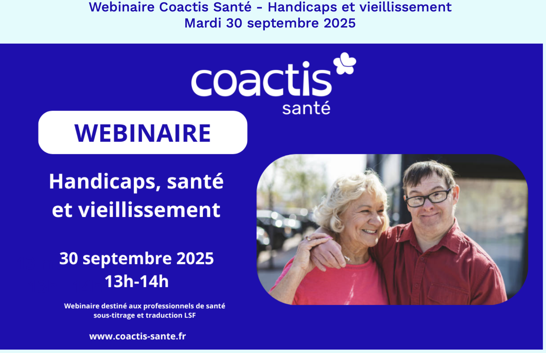 đź’ˇL’association Coactis SantĂ© organise un webinaire destinĂ© aux professionnels de santĂ© sur le thème Â« Handicaps, santĂ© et vieillissement Â» mardi 30 septembre 2025 de 13h Ă  14h ; un temps d’échange dĂ©diĂ© Ă  un sujet essentiel et encore trop peu explorĂ© : le vieillissement des personnes en situation de handicap.