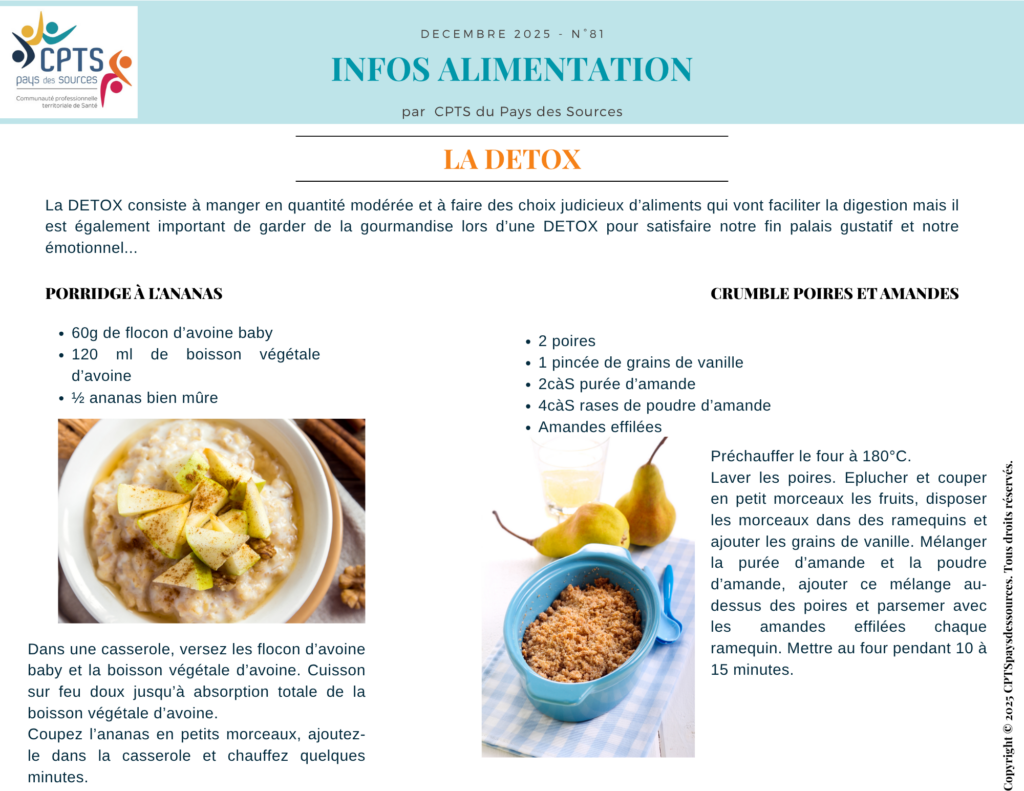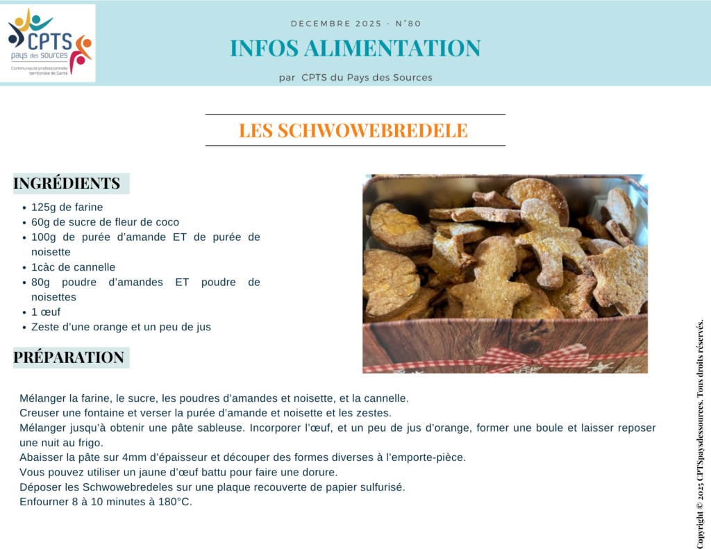 Retrouvez ci dessous les infos santé alimentation du mois de Décembre 2025 qui paraissent tous les vendredis sur notre page Facebook.